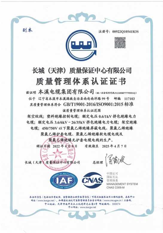 長城質(zhì)量保證中心質(zhì)量管理體系認(rèn)證證書
